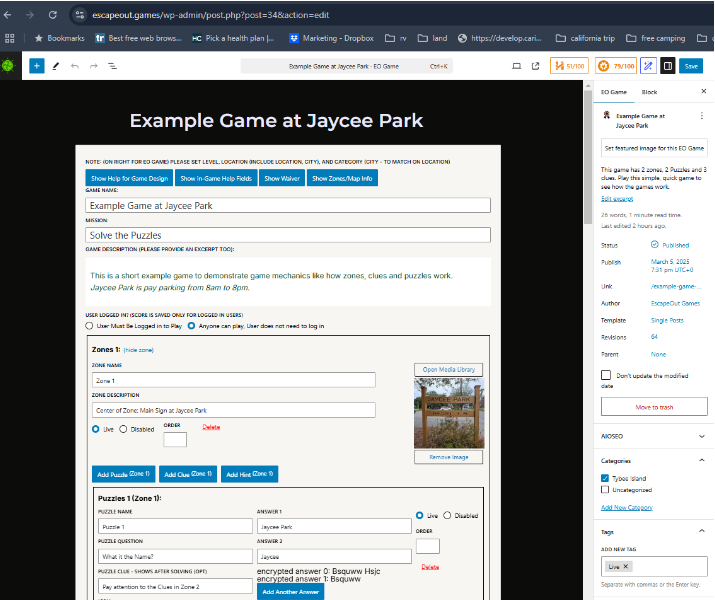 These EscapeOut.Games are built with a custom plugin for WordPress. The game is a block on a custom post. You create and edit the game post and block as you would most posts and blocks for WordPress.